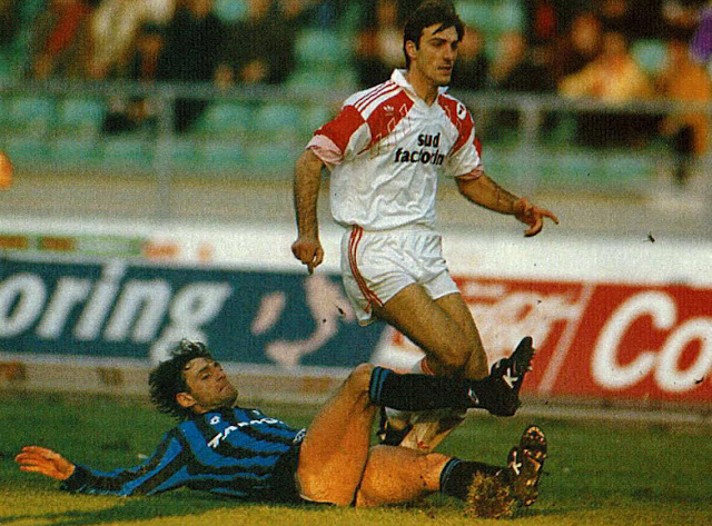 Stesso identico template con i loghi giganteschi della Lotto in overlay per la maglia di riserva della Fiorentina (qui Salvatori impegnato contro Scifo del Torino).